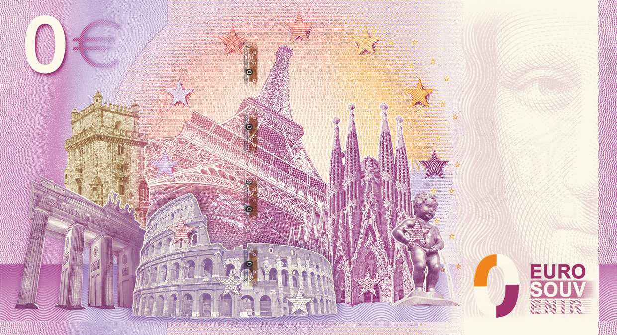 Fabricado en papel moneda, el Euro Souvenir lleva las siguientes características de seguridad, a saber: marcas de agua, tiras de cobre, impresión en relieve (sensible al tacto), holograma, registro transparente, fondo de seguridad de la imprenta, tinta fluorescente visible bajo luz ultravioleta y un número de serie individual, único para cada billete.